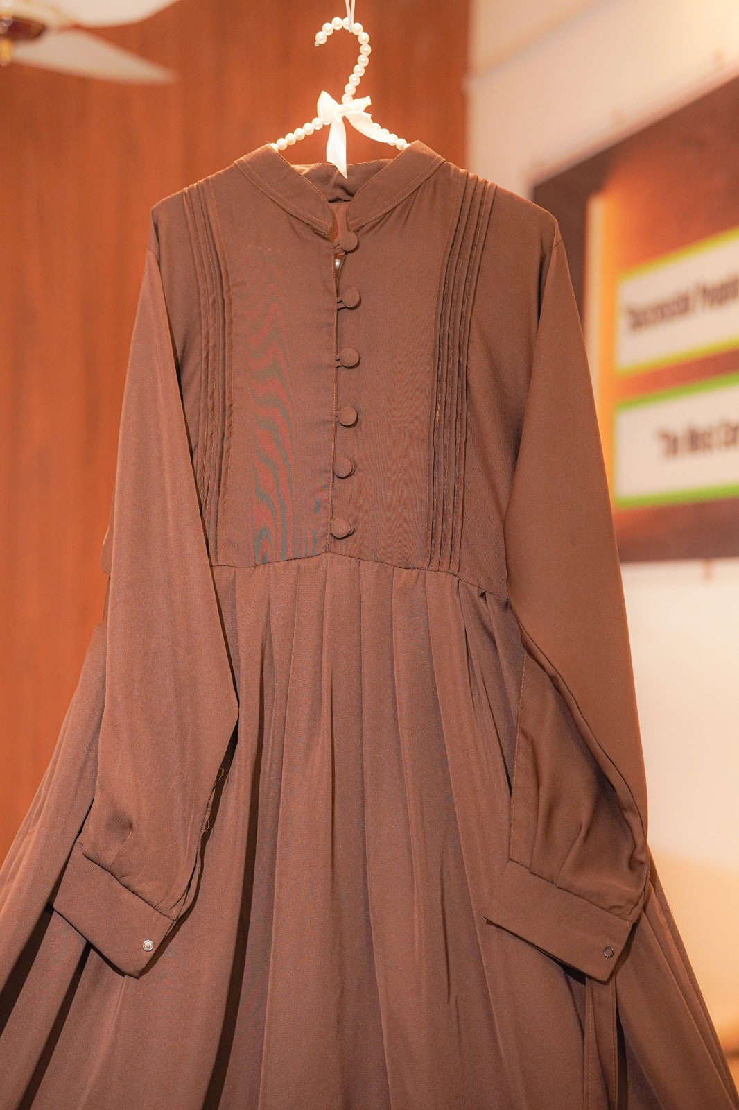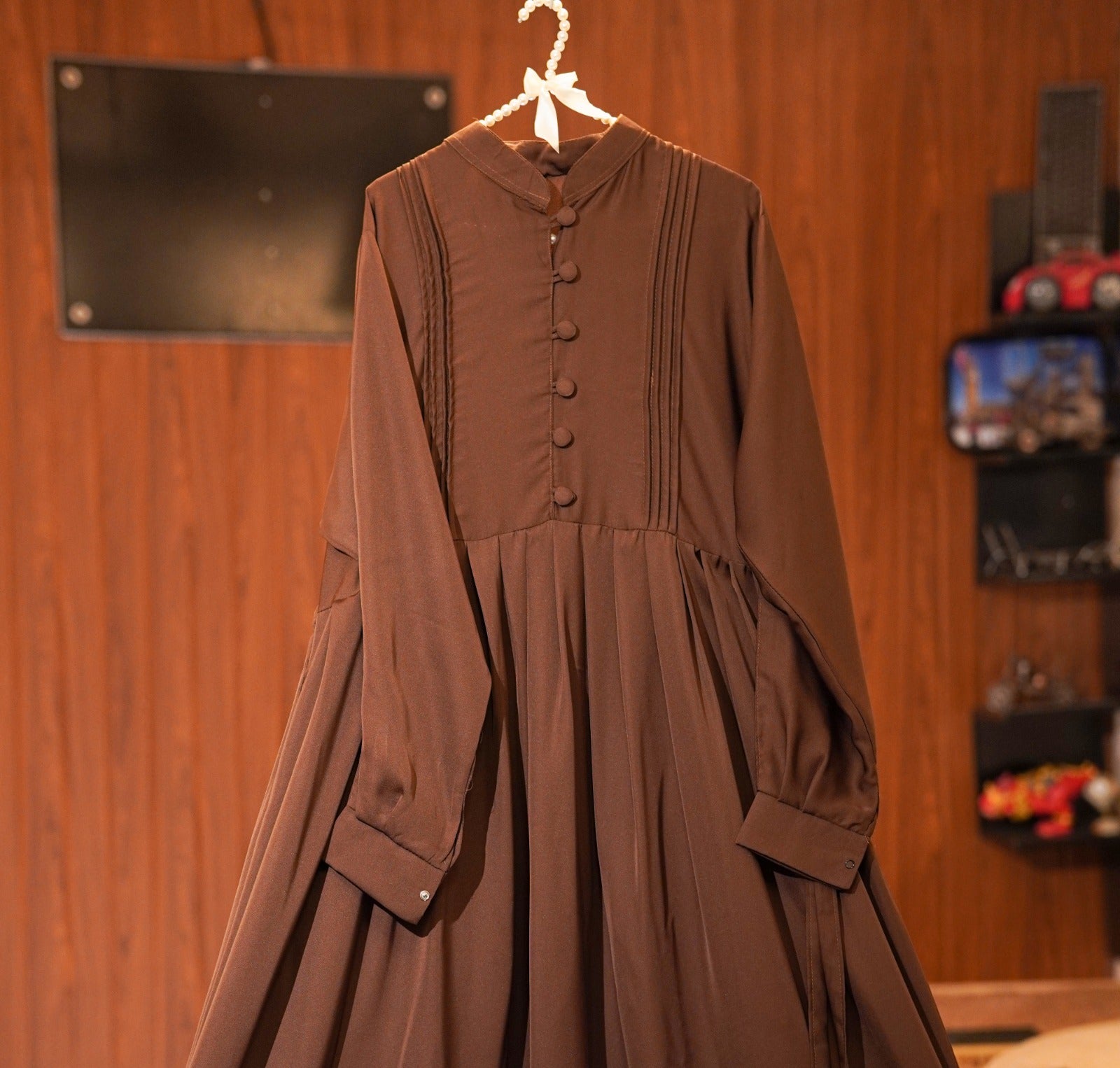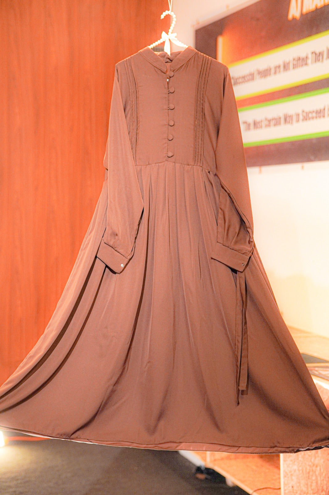 Introducing the Mocha Grace Pleated Abaya, a beautifully crafted piece designed for women who love timeless elegance with modern comfort. This abaya features a rich coffee-brown color that adds warmth and sophistication to any wardrobe. The top bodice is detailed with fine vertical pleats and a row of fabric-covered buttons, giving it a refined, vintage-inspired look that stands out effortlessly.