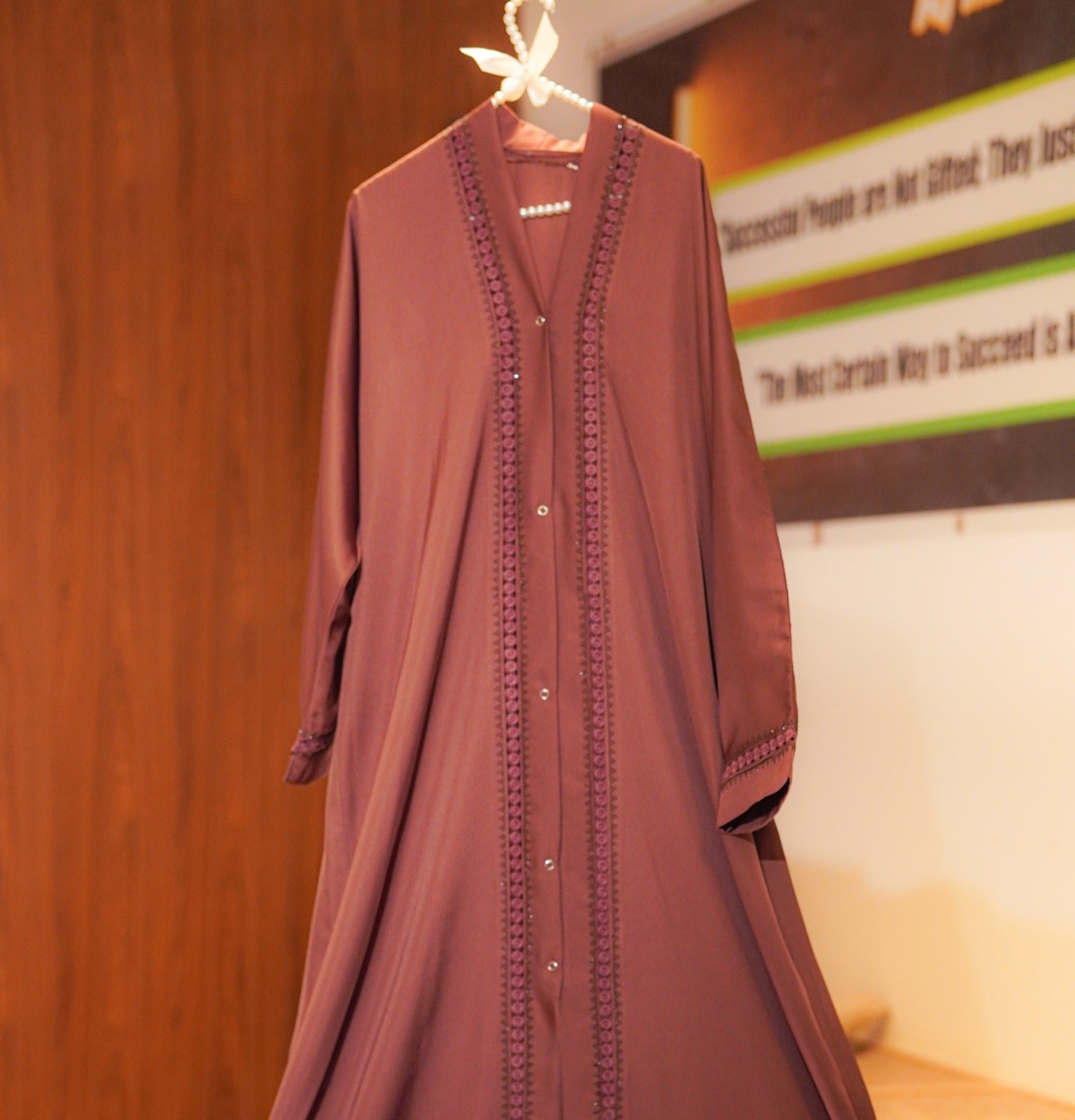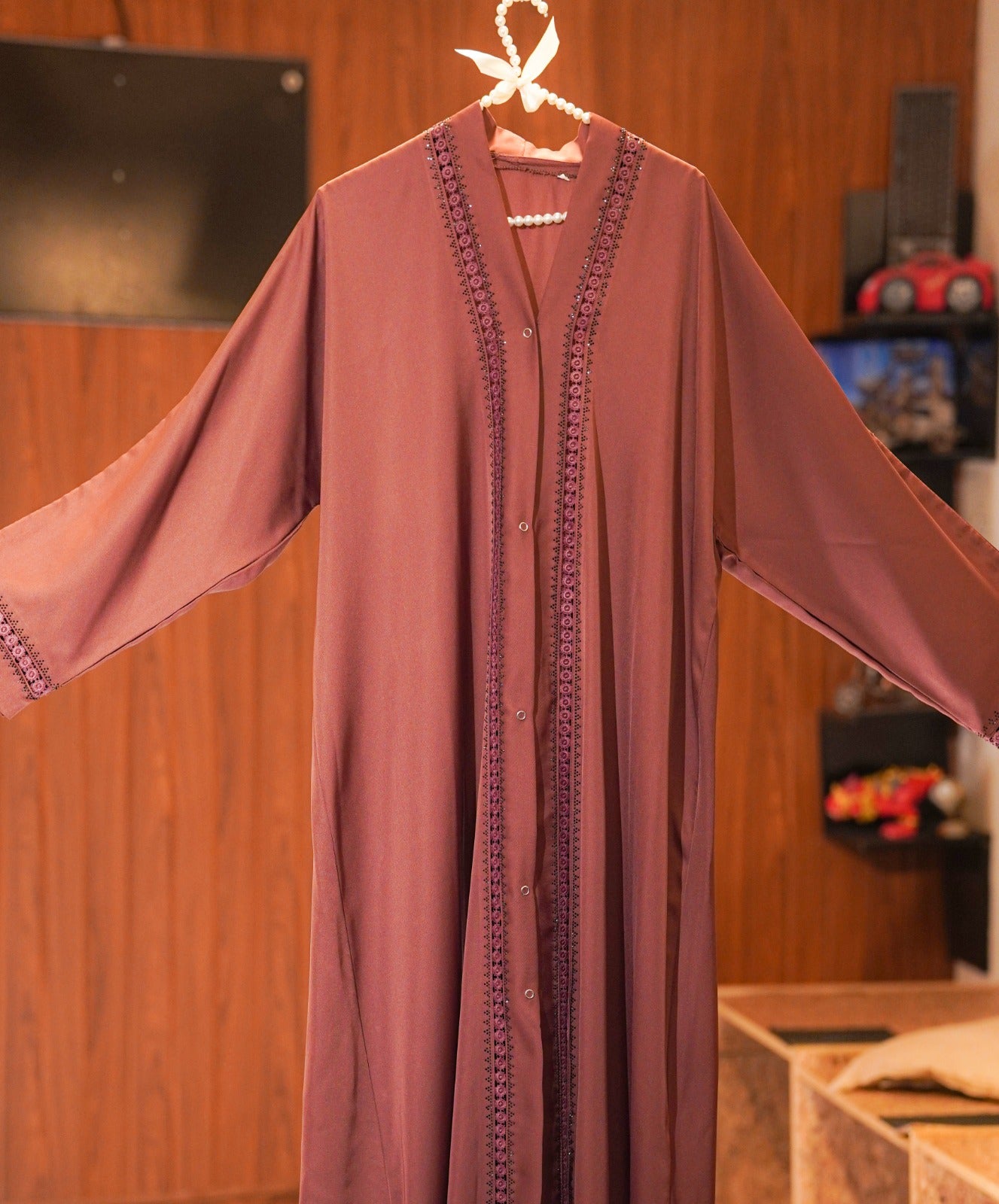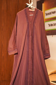 Introducing this elegant maroon front-open abaya, designed for women who appreciate a blend of modesty, comfort, and effortless style. Crafted from a soft, flowy fabric, it drapes beautifully and provides a smooth, graceful silhouette. The abaya features delicate embroidered detailing running along the front panel and sleeves, adding a refined and luxurious touch without being overly flashy.